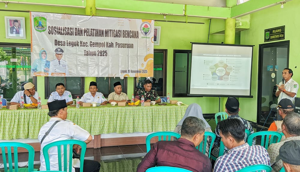 Pemerintah Desa Legok, Kecamatan Gempol, Kabupaten Pasuruan menggelar Sosialisasi dan Pelatihan Mitigasi Bencana pada Rabu (19/11/2025).