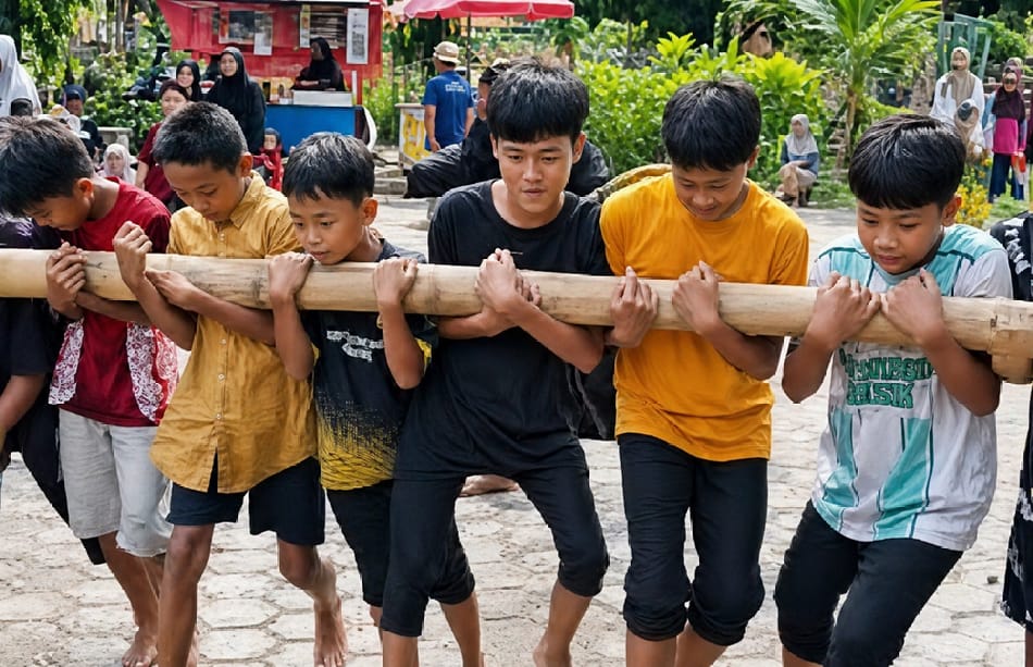 Sejumlah siswa terlihat antusias saat memeluk dan menggendong sebatang bambu di dada mereka. Tawa lepas dan ekspresi gembira tampak jelas ketika mereka berusaha menahan guncangan bambu yang terus bergerak mengikuti irama musik tradisional.